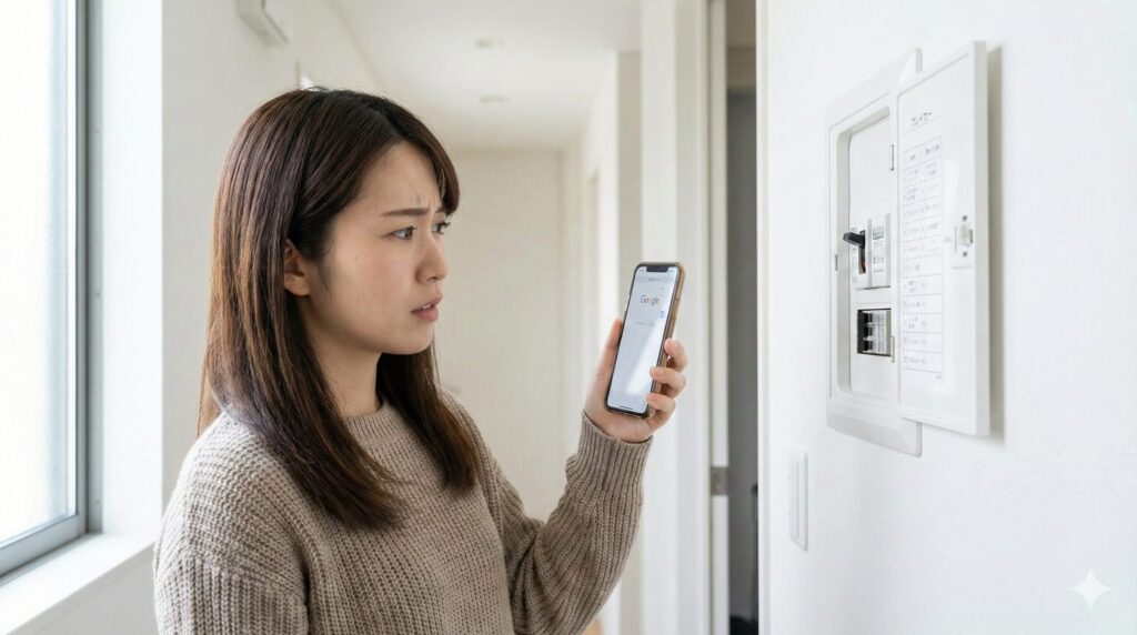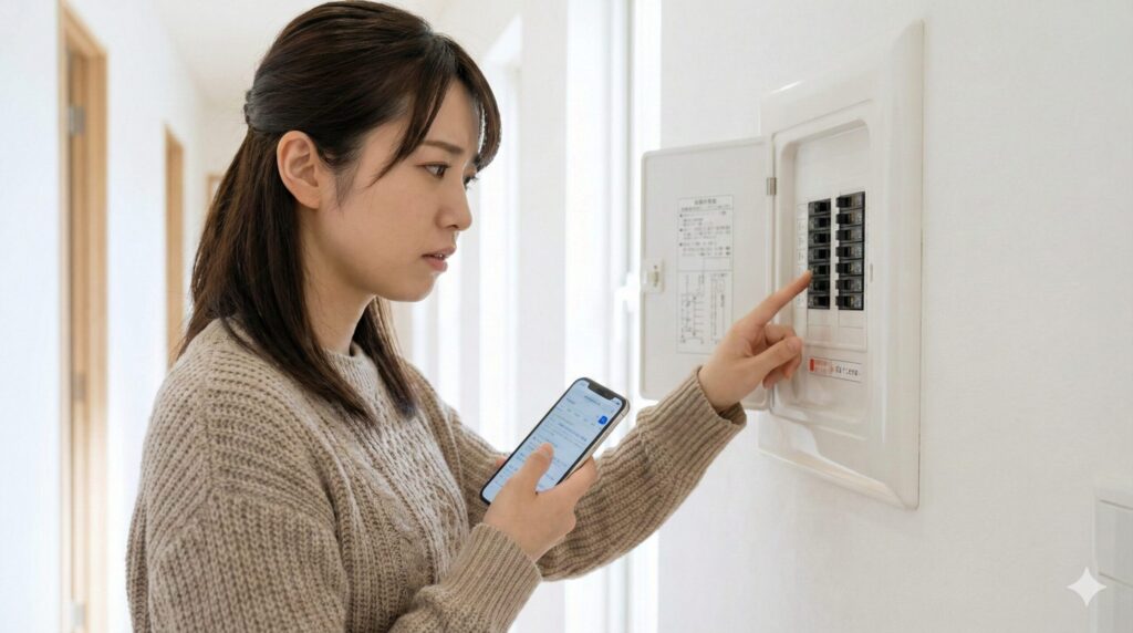 家全体の電気が消えてしまった場合、まずは分電盤を確認してみてください。一番大きな「主幹漏電ブレーカー」が落ちていれば、家中のどこかで電気が漏れているサインです。もし「給湯器」と書かれた小さな分岐ブレーカーだけが落ちているなら、原因は給湯器に絞られます。