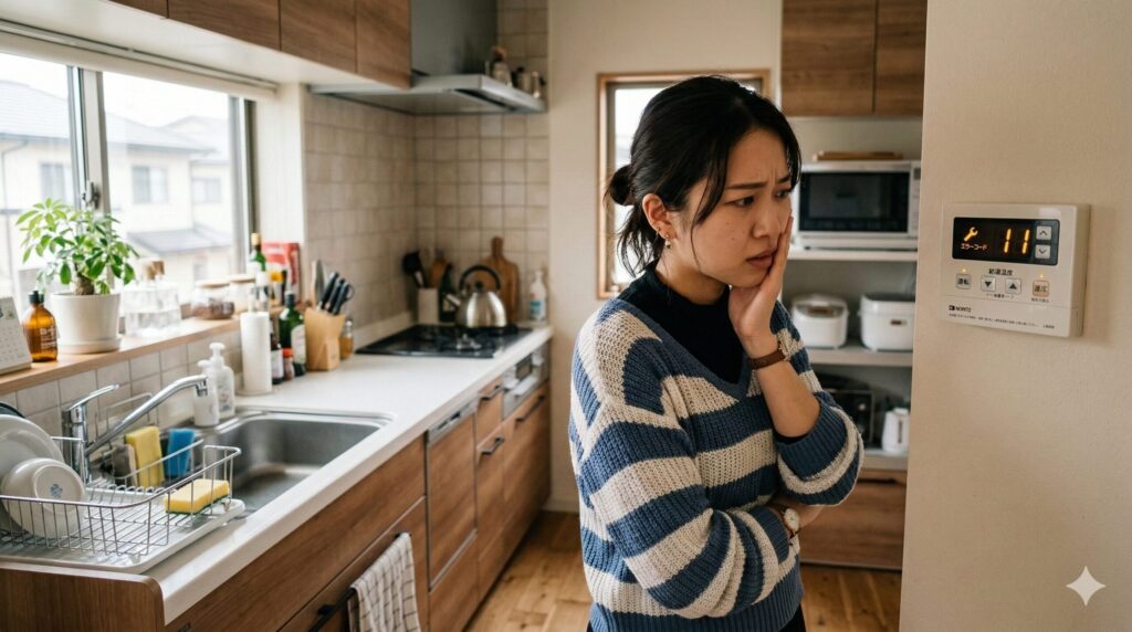 リモコンの残湯量表示がゼロになっていれば、それは故障ではなくシステムの仕様です。沸き増しボタンを押して、お湯が溜まるのを待つしかありません。また、お風呂の蛇口からは水が出るのに、台所ではお湯が出るという場合は、蛇口側の混合水栓(サーモスタット)が壊れている可能性もあります。ボイラー本体を疑う前に、家中すべての蛇口でお湯が出ないか確認してみるのが賢い方法かなと思います。