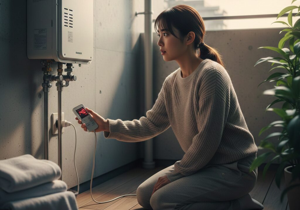 リモコンの操作だけでエラーが消えないときは、最終手段として給湯器本体の電源プラグを一度抜き、数十秒待ってから差し直してみてください。これで制御基板がリセットされ、お湯が出るようになるケースも稀にあります。