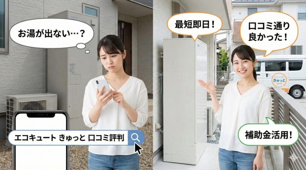 最終的にどの業者に頼むかは、やはり納得感が大切です。今回、エコキュートの交換を専門とする「きゅっと」の口コミや評判を調査して分かったのは、スピード・価格・品質のバランスが非常に高いレベルで取れているということです。